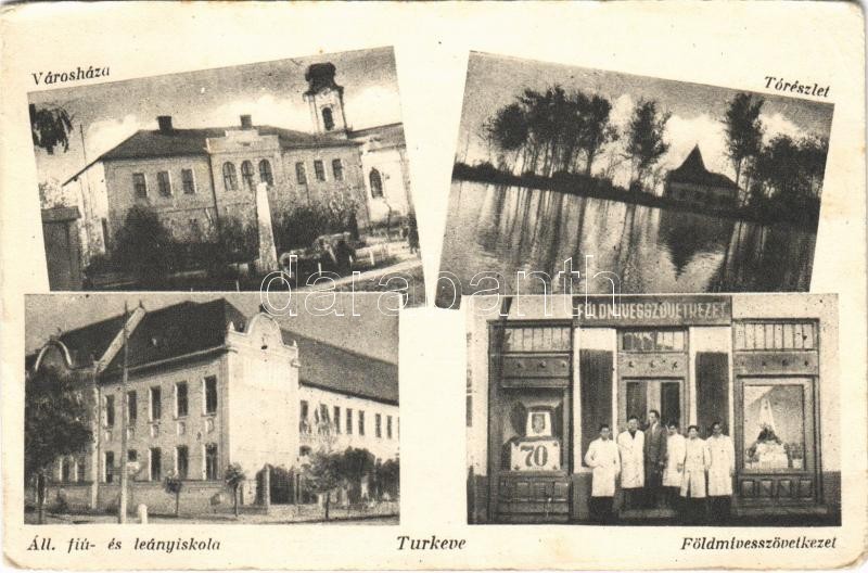 Túrkeve, Városháza, tó, Földmívesszövetkezet üzlete, Állami fiú és leá...