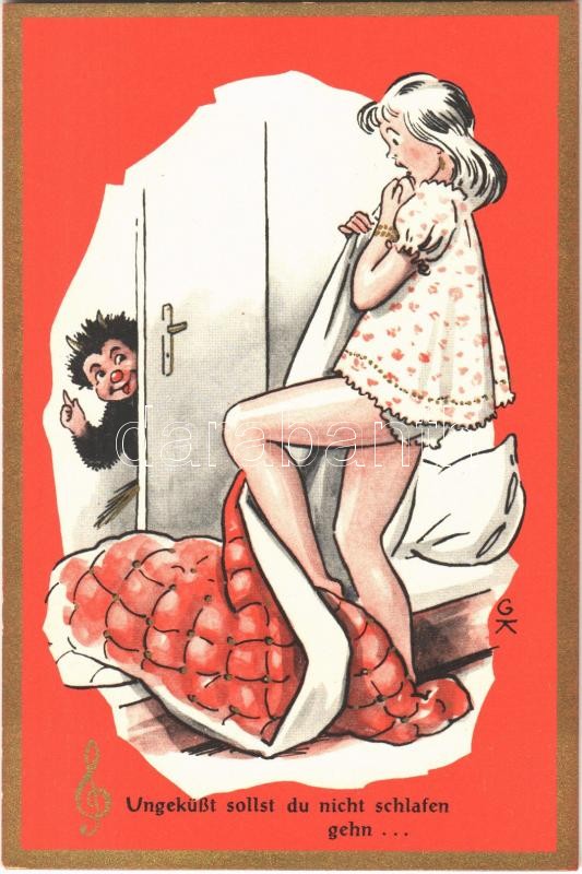 Ungeküßt sollst du nicht schlafen gehn... / Krampus with lady, erotic humour - modern art postcard
