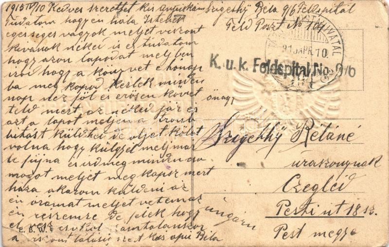 Description: 1915 Vorwärts! Mit Gott für Kaiser und Vaterland / WWI Austro-Hungarian K.u.K. military propaganda, coat of arms. Emb. + "K.u.K. Feldspital No. 9/6" (EK)
