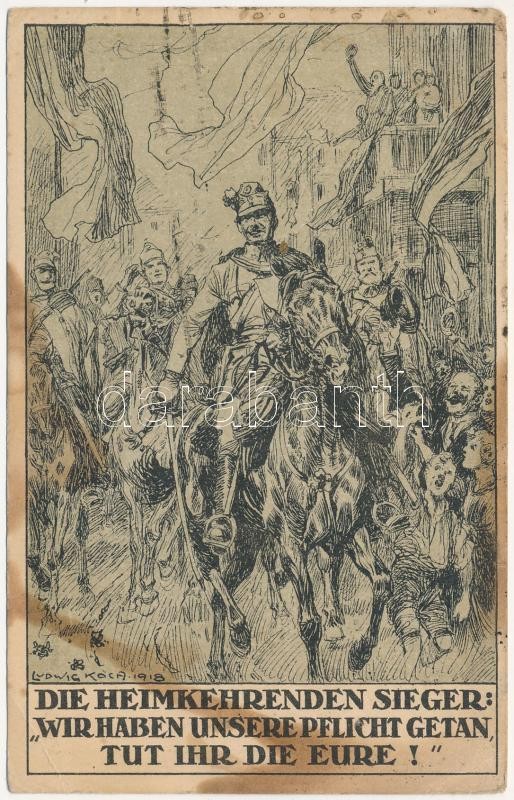 Description: 1918 Die heimkehrenden Sieger: "Wir haben unsere Pflicht getan, tut Ihr die Eure!" / WWI Austro-Hungarian K.u.K. military art postcard s: Ludwig Koch (fl)