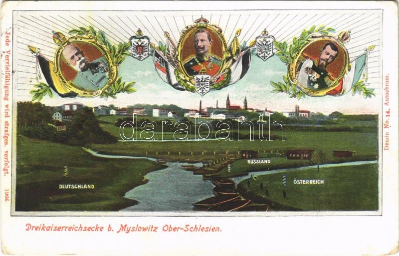 Description: 1914 Myslowice, Myslowitz (Ober-Schlesien); Dreikaiserreichsecke. Jede Vervielfältigung wird strafges verfolgt 1906. No. 14. Autochrom / Three Emperors' Corner, German-Austro-Russian triple border, Franz Joseph, Wilhelm II and Nicholas II of Russia. Art Nouveau (EK)