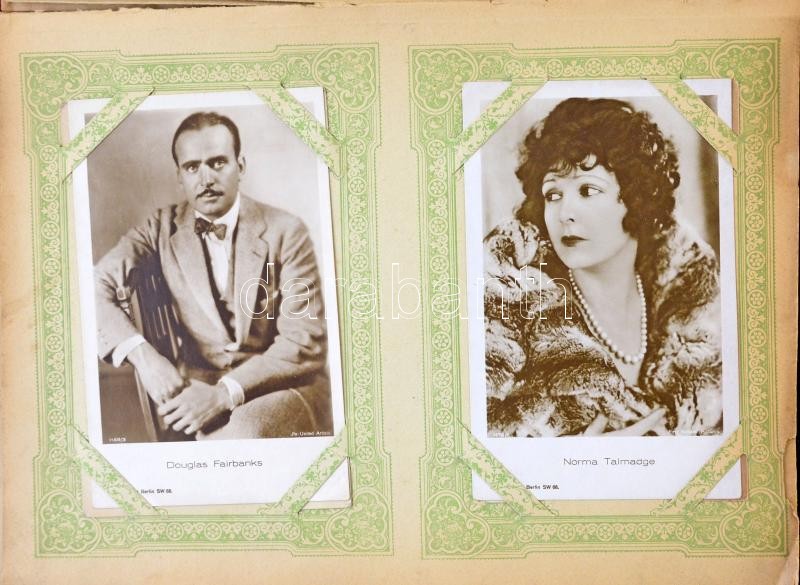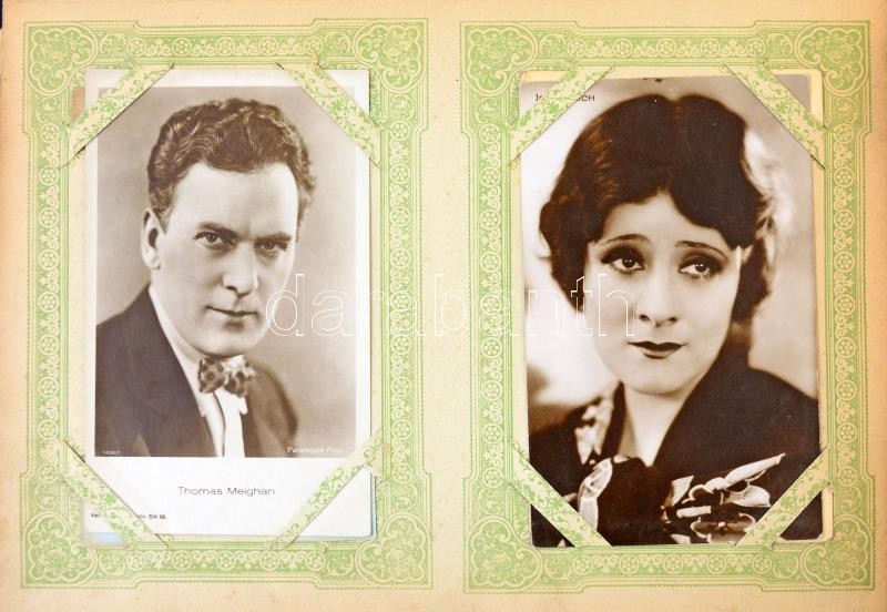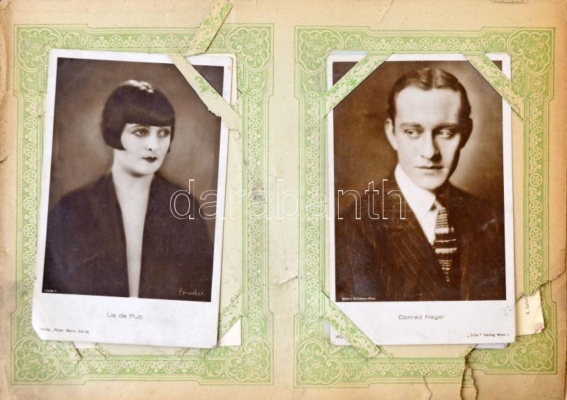 Description: 88 db RÉGI motívum képeslap hibás albumban: magyar és főleg külföldi színészek / 88 pre-1945 motive postcards in a damaged album: Hungarian and mostly other foregin actors