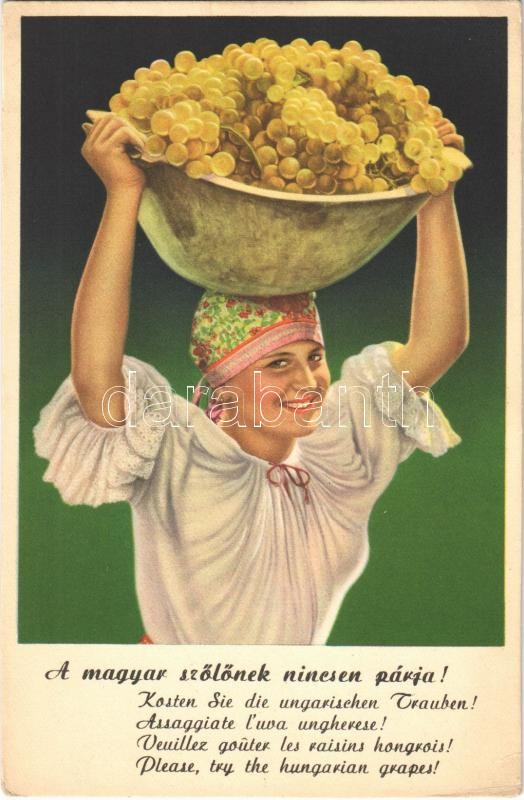 A magyar szőlőnek nincsen párja. Magyar szőlő reklámja, folklór. Klösz... https://www.darabanth.com/en/395-Online-auction/395.0/Postcards/Propaganda-politics~1000086/A-magyar-szolonek-nincsen-parja-Magyar-szolo-reklamja-folklor-Klosz-Gyorgy-es-Fia-kiadC3~II2400510