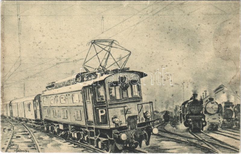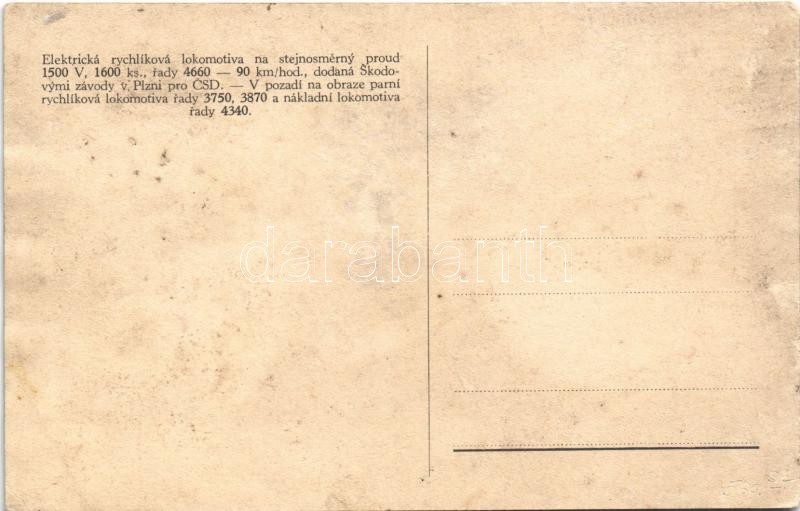 Elektrická rychliková lokomotiva na stejnosmérny proud 1500 V, 1600 ks., rady 4660 - 90 km/hod., dodaná Skodovymi závody v Plzni pro CSD. V pozadí na obraze parní rychlíková lokomotiva rady 3750, 3870 a nákladní lokomotiva rady 4340 / Czechoslovakian State Railways. Electric high-speed locomotive supplied by Skoda's plants in Pilsen. In the background, the picture shows a steam express locomotive (series 3750, 3870) and a freight locomotive (series 4340) (ázott / wet damage)