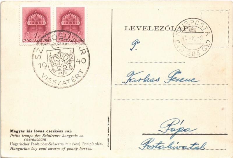 1940 Magyar kis lovas cserkész raj / Ungarischer Pfadfinder-Schwarm mit Ponipferden / Hungarian boy scouts on horsebacks + "1940 Szamosújvár visszatért" So. Stpl. (felületi sérülés / surface damage)