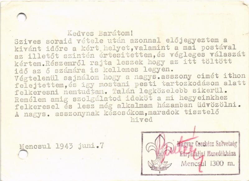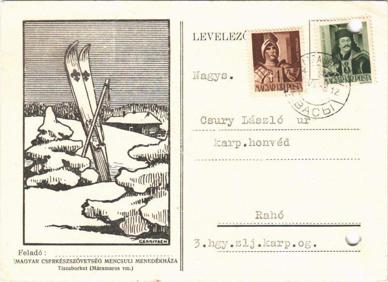 1943 Magyar Cserkészszövetség menedékháza a tiszaborkúti Mencsulon, sí... https://www.darabanth.com/en/395-Online-auction/395.0/Postcards/Scout~1000067/1943-Magyar-Cserkeszszovetseg-menedekhaza-a-tiszaborkuti-Mencsulon-silecek-Hungarian-boy-~II2402037