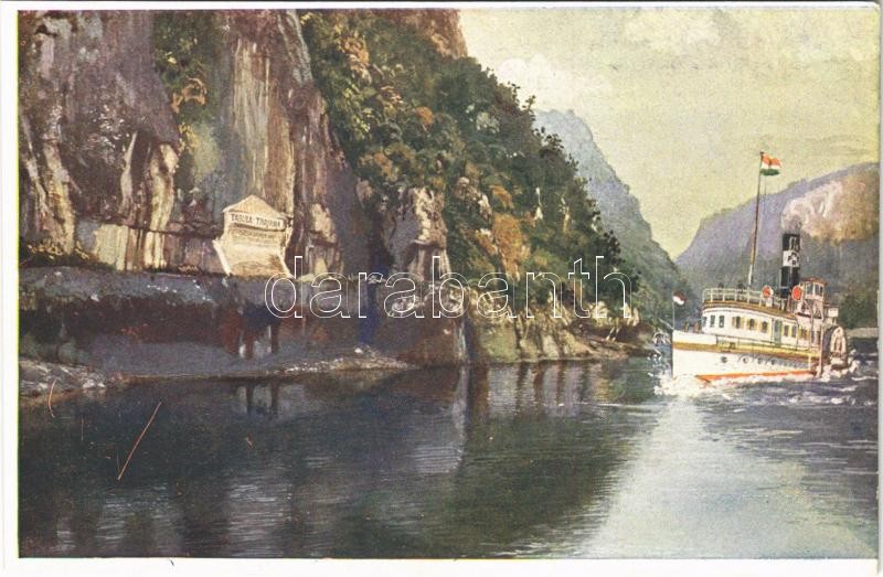Kazán-szoros, "Margit" termesgőzös, oldalkerekes gőzhajó. MFTR Művészlevelzőlap / "Margit" Hungarian sidewheeler passenger steamer, Cazane Gorge, Tabula Trajana - képeslapfüzetből / from postcard booklet