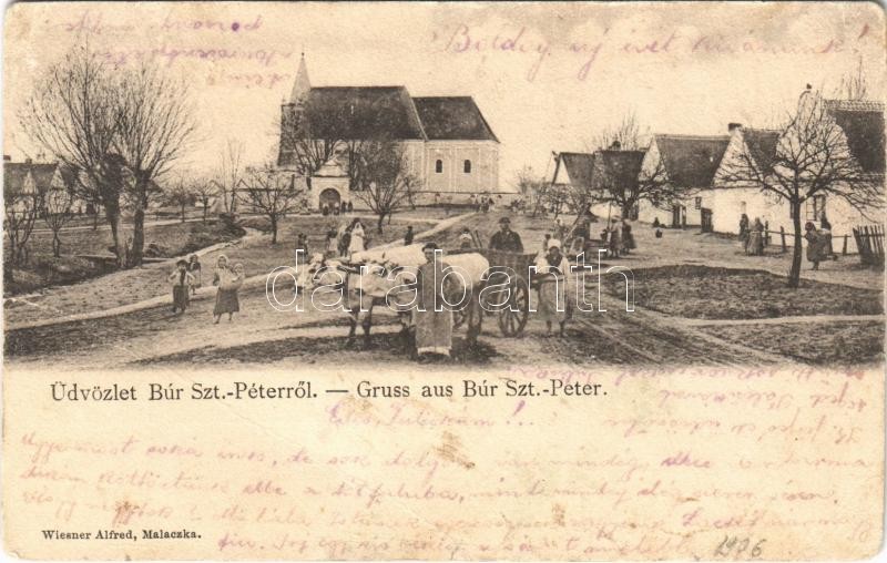 1906 Búrszentpéter, Borsky Peter (Búrszentmiklós, Borsky Mikulás); Fő tér, ökörszekér, templom. Wiesner Alfréd / main square, oxen cart, church (Rb)