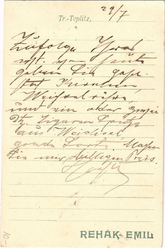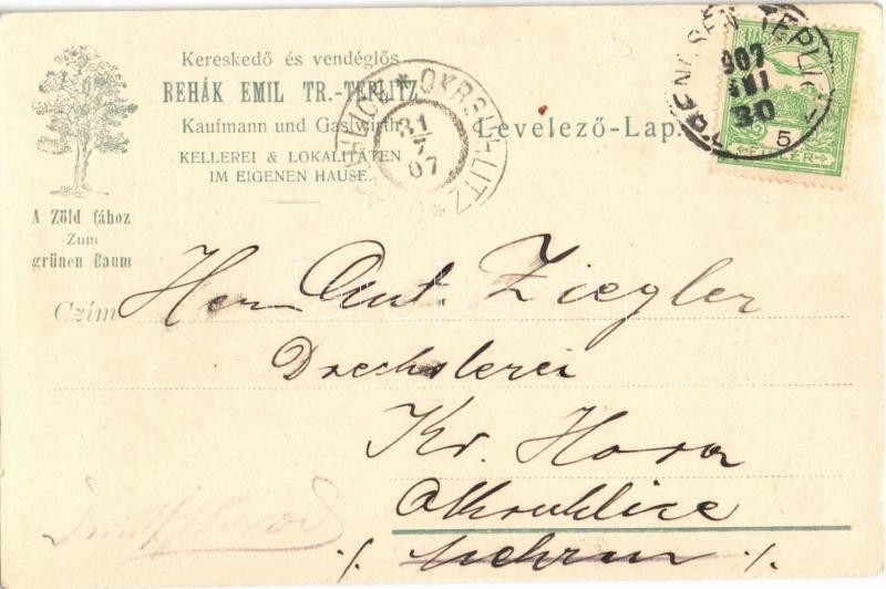 1907 Trencsénteplic, Trencianske Teplice; Rehák Emil kereskedő és vendéglős "A Zöld Fához" reklámlapja / shop and restaurant advertising