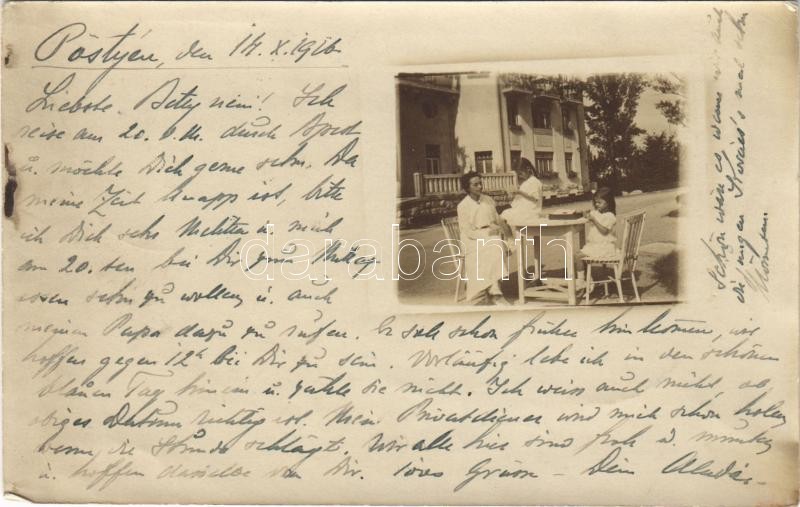 1916 Pöstyén, Piestany; hölgy kislányokkal nyaraló előtt / lady with her daughters in front of a villa. photo
