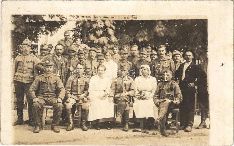 1917 Pozsony, Pressburg, Bratislava; sérült katonák csoportképe ápolónőkkel a kórház udvarán / WWI K.u.K. military hospital, injured soldiers with nurses. photo