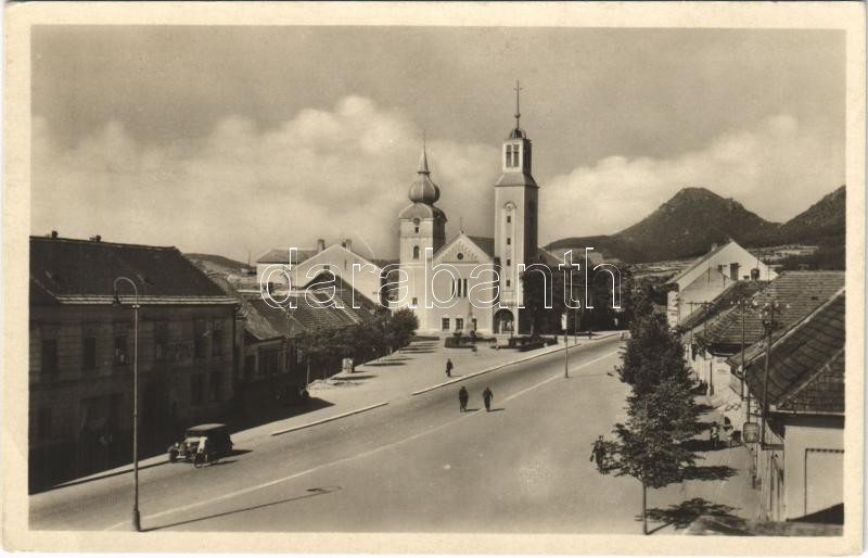 1954 Vágbeszterce, Povazská Bystrica; utca, templom, automobil, vendég...
