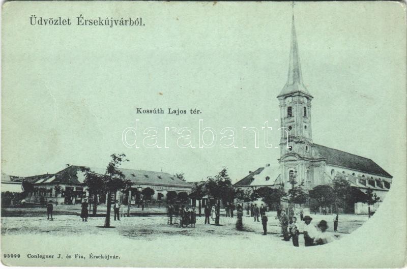 Érsekújvár, Nové Zámky; Kossuth Lajos tér, templom, gyógyszertár, Conlegner és Fia üzlete és saját kiadása (gyűrődés / crease)