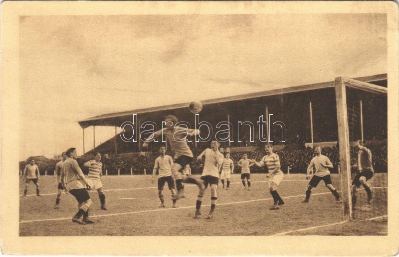 Description: 1913. március 16. FTC-MTK labdarúgó mérkőzés. Corner helyzet, Bíró Gyuszi gyönyörű fejessel véd. Kiadja a 'Klasszikus pillanatok vállalata' 7. sz. / Hungarian football match