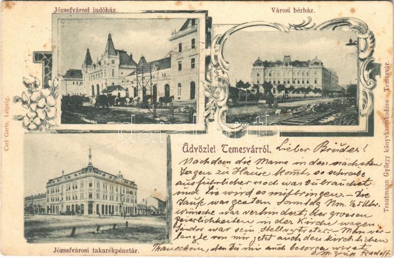 1898 (Vorläufer) Temesvár, Timisoara; Józsefvárosi indóház, vasútállomás, városi bérház, takarékpénztár. Trautmann György kiadása / Iosefin railway station, savings bank, tenement house. Art Nouveau, floral (EK)