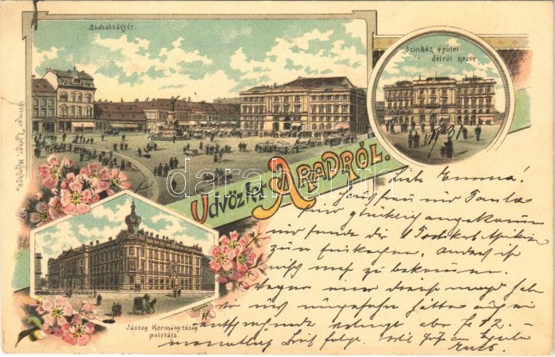 1899 (Vorläufer) Arad, Szabadság tér, színház épület délről nézve, József Kormányzóság palotája / square, theatre, Governing palace. Ottmar Zieher Art Nouveau, floral, litho (EB)