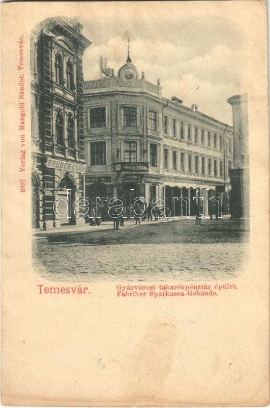 1899 (Vorläufer) Temesvár, Timisoara; Gyárváros, Takarékpénztár épület, Brüder Kohn, Duschnitz László üzlete. Mangold Sándor kiadása / Fabric, savings bank, shops