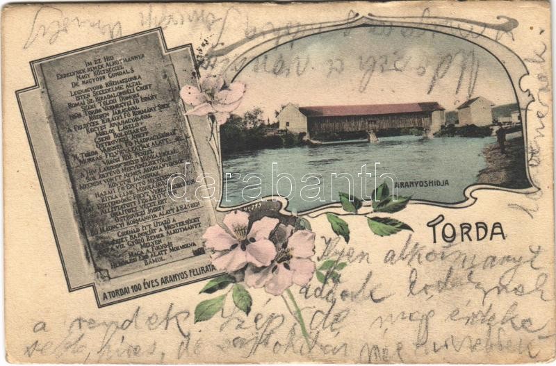 1904 Torda, Turda; A 100 éves Aranyos híd felirata / text of the 100 years old bridge. Art Nouveau, floral