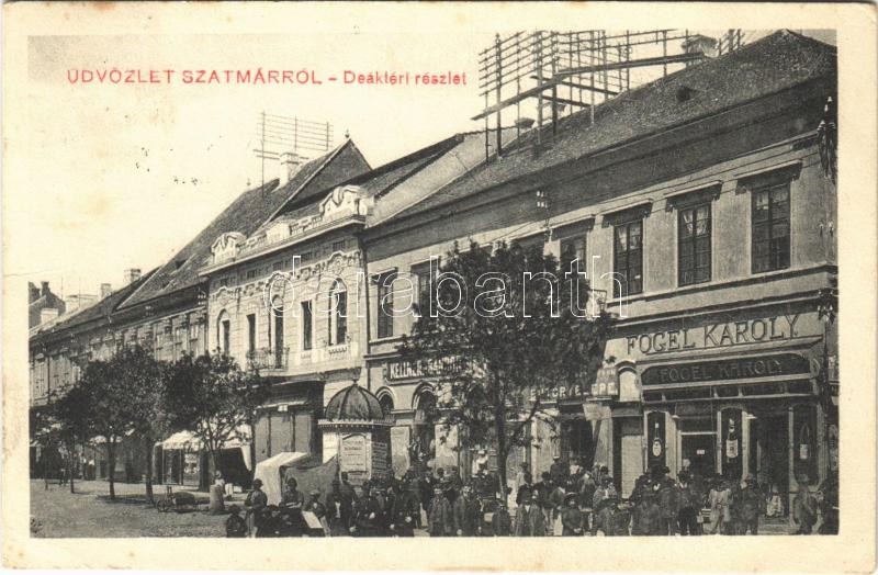 1910 Szatmárnémeti, Szatmár, Satu Mare; Deák tér, Fogel Károly, Kellner Sándor üzlete, bútortelep, piac / square, shops, furniture store, market (EK)