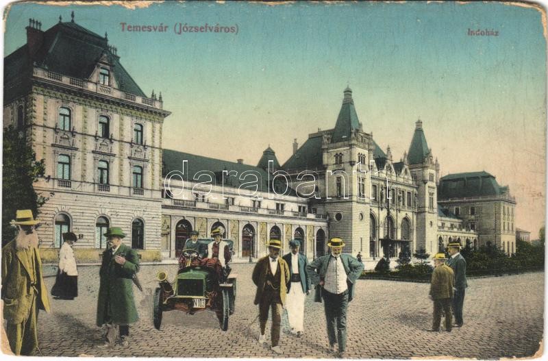 1911 Temesvár, Timisoara; Józsefváros, indóház, vasútállomás, autó / I...
