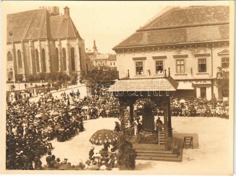 Description: 1915 Kolozsvár, Cluj; Ünnepség a Kárpátok őre szobor avatásakor, Tamási Tamás és fia üzlete / celebration at statue inauguration. photo (11,6 x 8,7 cm)