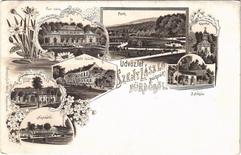 Püspökfürdő, Szentlászlófürdő, Baile 1 Mai; fürdő épület, indóház, vasútállomás, park, Lőrinc fürdő, Népszálló. Sonnenfeld Adolf kiadása / spa, railway station, park, hotel. Art Nouveau, floral, litho