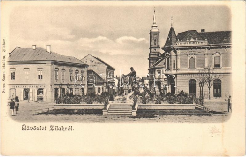 Zilah, Zalau; gyógyszertár, szobor, Bikfalvy testvérek és Ifj. Bokor István üzlete / pharmacy, shops, statue