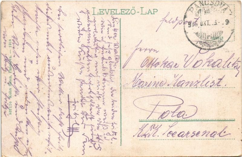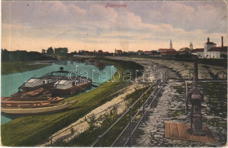 1916 Pancsova, Pancevo; folyópart, kerekes kút, hajó / riverside, well, ship