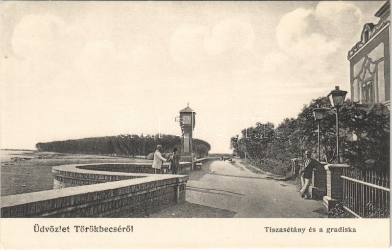 Törökbecse, Újbecse, Novi Becej; Tisza sétány és a gradiska. Wukow Const. fényképész felvétele és kiadása / Tisa promenade
