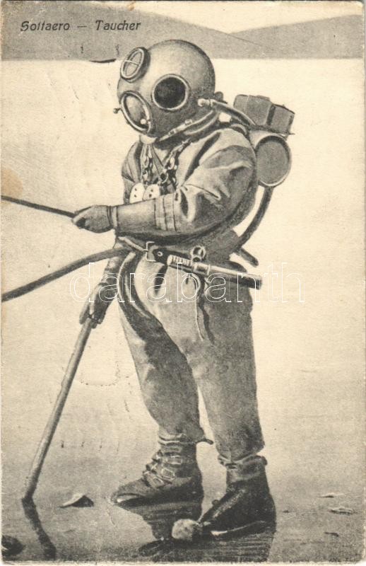1910 Osztrák-Magyar Haditengerészet búvárja teljes felszerelésben / Sottaero / Taucher der K.u.K. Kriegsmarine. G. Fano 1910. / Austro-Hungarian diver (EB)