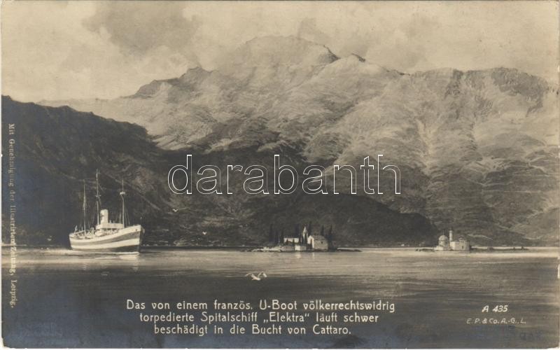 Description: 1916 Das von einem französ. U-Boot völkerrechtswidrig torpedierte Spitalschiff "Elektra" läuft schwer beschädigt in die Bucht von Cattaro / WWI Austro-Hungarian Navy, K.u.K. Kriegsmarine art postcard, heavily damaged hospital ship "Elektra" in the Bay of Kotor (torpedoed by French submarine Ampere) s: Richard Assmann