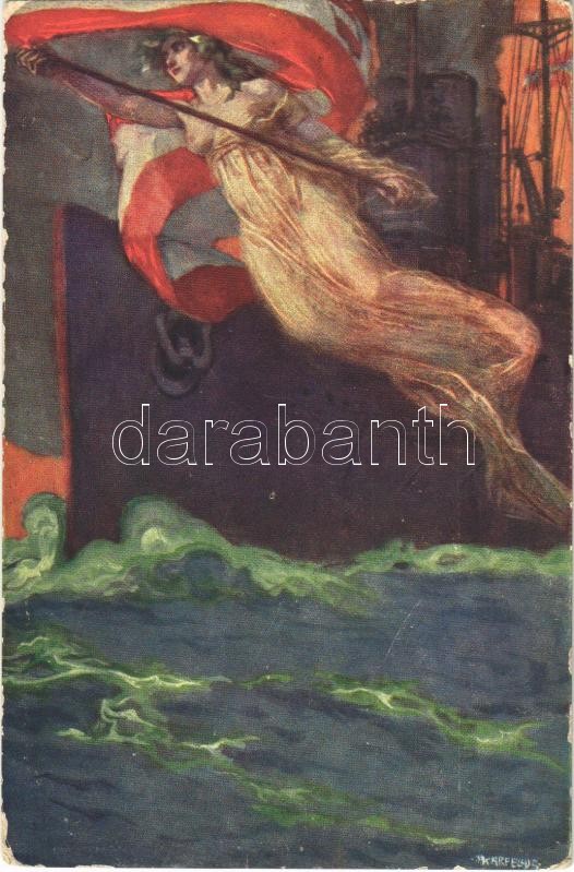 Description: 1917 Offizielle Postkarte des Österreichischen Flottenvereines zu Gunsten des Kriegsfürsorgeamtes, des Kriegshilfsbüros und des Roten Kreuzes / WWI Austro-Hungarian Navy art postcard, K.u.K. Kriegsmarine, naval flag. artist signed (EK)