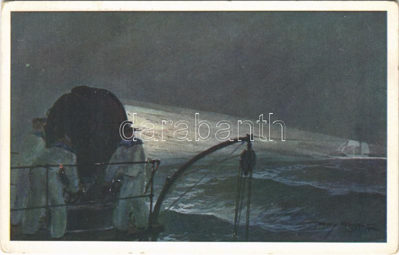 Description: Absuchen der See mit dem Scheinwerfer. K.u.K. Kriegsmarine. Offizielle Postkarte des Österreichischen Flottenvereines zu Gunsten des Kriegsfürsorgeamtes, des Kriegshilfsbüros und des Roten Kreuzes / WWI Austro-Hungarian Navy art postcard, mariners search through the sea with spotlight s: Harry Heusser (EK)