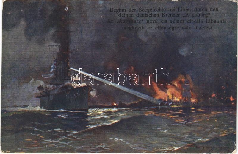 Description: Beginn der Seegefechte bei Libau durch den kleinen deutschen Kreuzer "Augsburg" / Az "Augsburg" nevű kis német cirkáló Libaunál megkezdi az ellenségre való tüzelést / WWI Imperial German Navy (Kaiserliche Marine) art postcard, SMS Augsburg light cruiser begins firing at Liepaja (Latvia) s: Harry Heusser (fa)