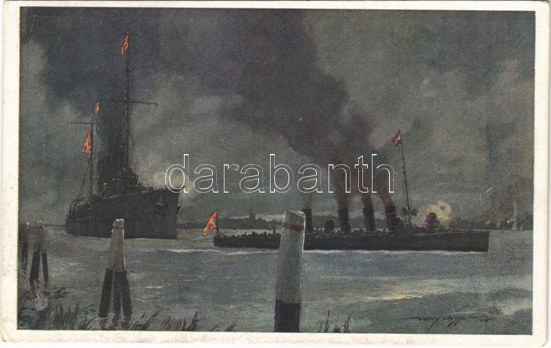 SMS Novara und Scharfschütze im Kanal von Porto Corsini bei Beschießung der italienische Strandbatterien am 24. Mai 1915 / WWI Austro-Hungarian Navy art postcard, K.u.K. Kriegsmarine, light cruiser SMS Novara and SMS Scharfschütze destroyer. Offizielle Postkarte des Österreichischen Flottenvereines zu Gunsten des Kriegsfürsorgeamtes des Kriegshilfsbüros und des Roten Kreuzes Nr. F. 44. s: Harry Heusser (Rb)