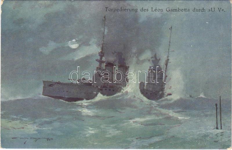 Torpedierung des "Leon Gambetta" durch "U-V" Offizielle Karte für Rotes Kreuz, Kriegsfürsorgeamt, Kriegshilfsbureau. Herausgegeben vom Österreichischen Flottenverein. K.u.K. Kriegsmarine / Az Osztrák-Magyar Haditengerészet U 5 tengeralattjárója által megtorpedózott francia páncélos Leon Gambetta elsüllyedése / WWI Austro-Hungarian Navy art postcard, "U-5" submarine sinks French armored cruiser Leon Gambetta s: Harry Heusser