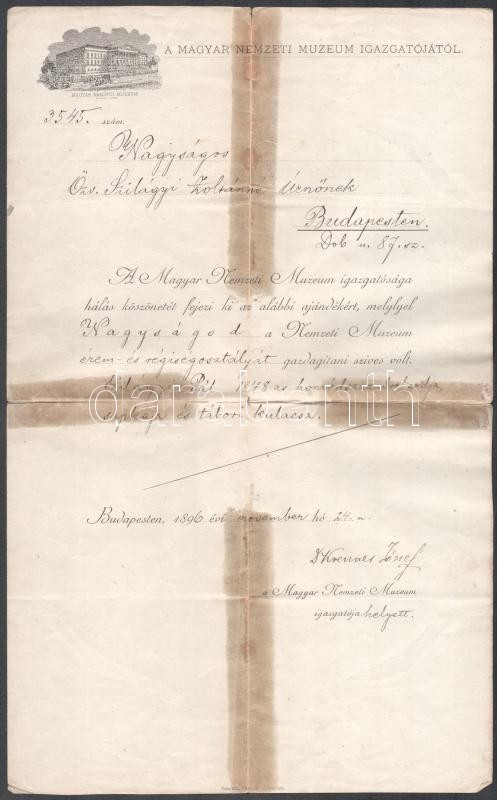 1896 A Magyar Nemzeti Múzeum köszönetnyilvánító levele özv. Szilágyi Z... https://www.darabanth.com/en/396-Online-auction/396.0/Art-and-other-collectibles/Historical-documents-manuscripts~500020/1896-A-Magyar-Nemzeti-Muzeum-koszonetnyilvanito-levele-ozv-Szilagyi-Zoltanne-reszere-h~II2407811