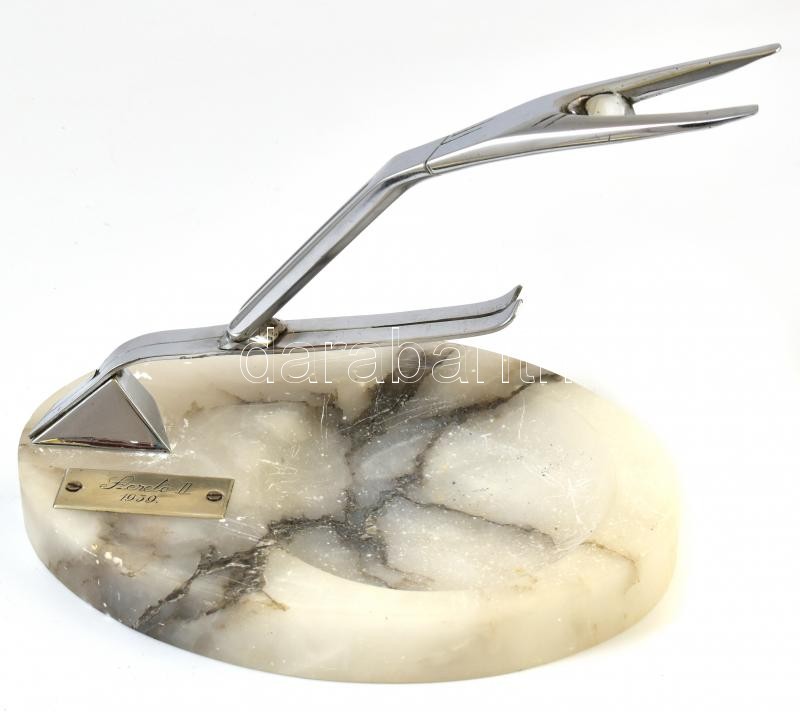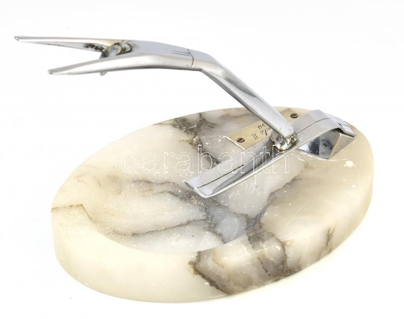 1939 Art deco síugrót ábrázoló krómozott fém szoborral díszített alabástrom névjegytartó. Kis gravírozott táblával. 25x17 cm