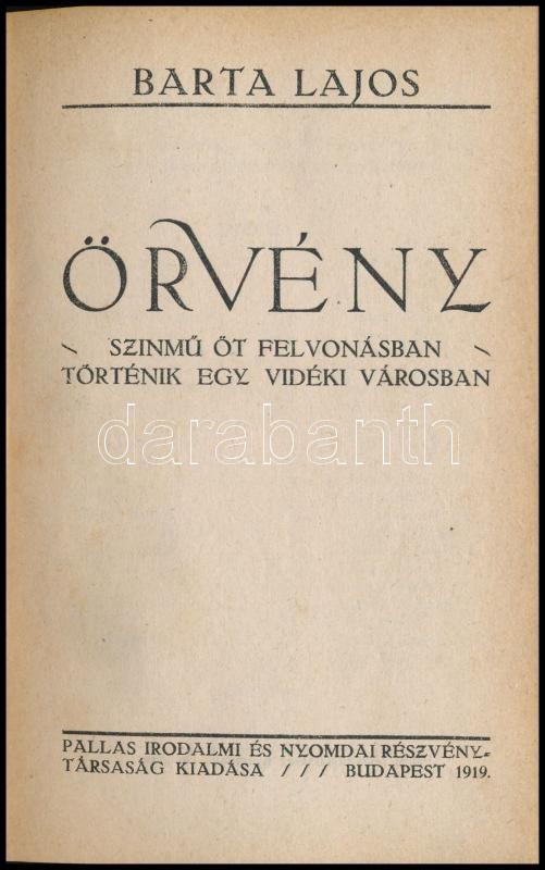 Barta Lajos: Örvény. Színmű öt felvonásban. Történik egy vidéki városb... https://www.darabanth.com/en/396-Online-auction/396.0/Books/Books-Other-rarities~1000024/Barta-Lajos-Orveny-Szinmu-ot-felvonasban-Tortenik-egy-videki-varosban-Bp-1919-Palla~II2410315