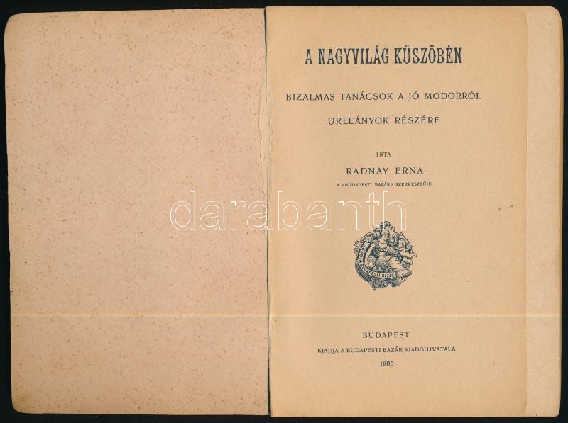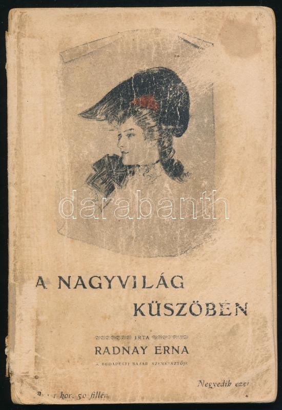Radnay Erna: A nagyvilág küszöbén. Bizalmas tanácsok a jó modorról urileányok részére. Első kiadás. Bp., 1905, Budapesti Bazár, 128 p. Kiadói illusztrált papírkötés, kopott, foltos borítóval, sérült, kissé hiányos gerinccel, egy lapon hosszú megjegyzéssel (126. o.)
