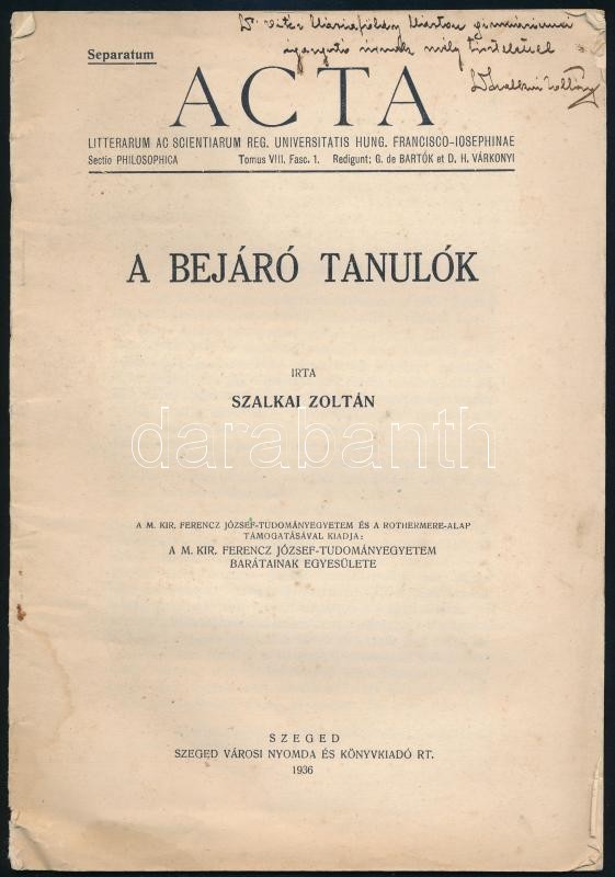 Szalkai Zoltán: A bejáró tanulók. Acta, 1. füzet. A borítón dedikálva. Szeged, Szeged Városi Nyomda és Könyvkiadó Rt., 1936. Szakadt, halvány foltos papírkötésben.