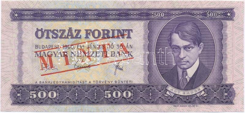 Description: 1969. 500Ft "E000 001210" sorozat és sorszámmal, piros "MINTA" felülnyomással és perforációval T:I / Hungary 1969. 500 Forint with "E000 001210" serial number and with red "MINTA" (SPECIMEN) overprint and perforation C:UNC Adamo F40Ma