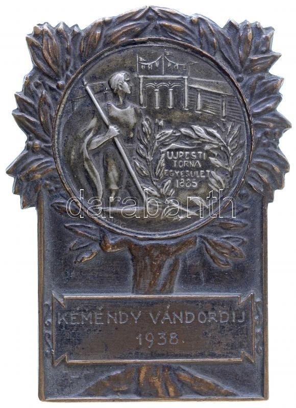 1938. "Újpesti Torna Egyesület 1885" Br sportplakett ezüstözött fém betéttel, "KÉMÉNDY VÁNDORDÍJ 1938" gravírozással, "LUDVIG BP" gyártói jelzéssel (62x45mm) T:2