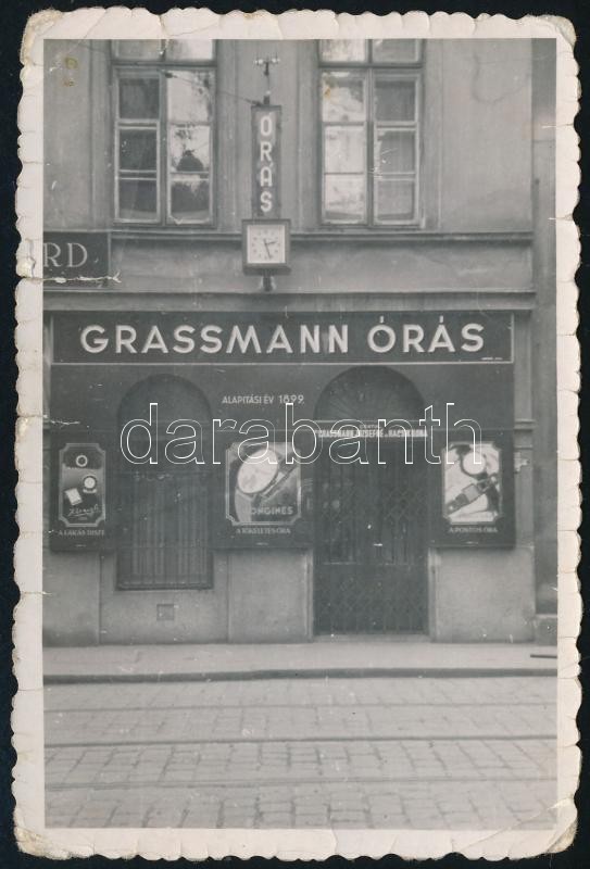 cca 1930-1940 Budapest, Irányi utca 7., Grassmann órás üzlete, fotó, sérülésekkel, 9×6 cm