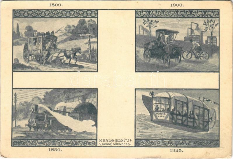 Description: Nürnberg, Nuremberg; 1800, 1850, 1900, 1925 / modes of transport in 1800 (horse-drawn carriage), 1850 (locomotive), 1900 (automobile and bicycle) and in 1925 (in the future) S. Bonné Art Nouveau (EK)