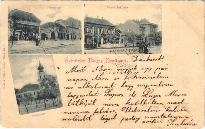 1899 (Vorläufer) Nagykőrös, Piac tér, Városháza, Városi szálloda, Trummer és Reiner üzlete. Bazsó Lajos kiadása (EK)