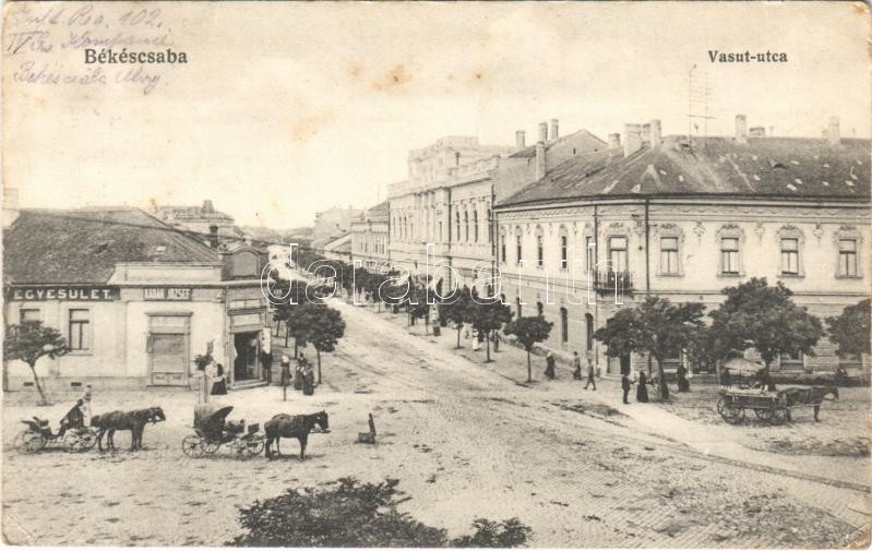 1916 Békéscsaba, Vasút utca, lovashintók, Egyesület, Kádár József üzle...