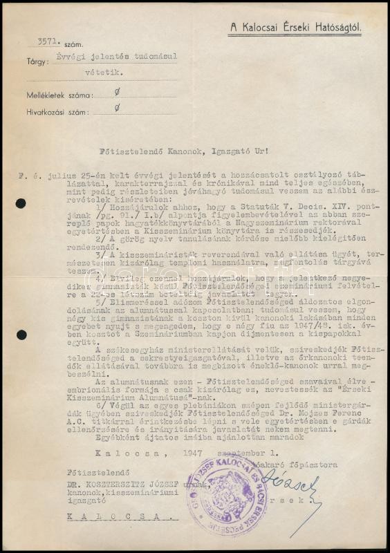 Description: 1947 Grősz József (1887-1961) kalocsai érsek autográf aláírása Koszterszitz József, írói nevén Koszter atya (1898-1970) kanonoknak, a kisszemináriumi igazgatónak címzett levélen, fejléces papíron, hajtásnyommal, lyukasztva