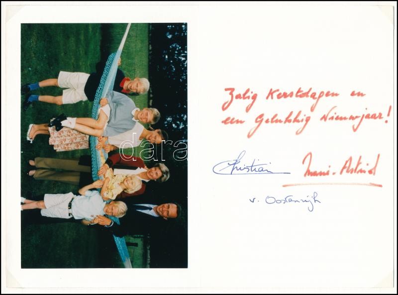 Carl Christian Habsburg herceg (1954-) és felesége Marie-Astrid (1954-) flamand v. holland nyelvű sorai és autográf aláÃrásai kártyán, mellékelve egy családi fotó a gyerekeikkel a kártyára ragasztva. Lapra montÃrozva (nem ragasztva). / Archduke Carl Christian of Austria (1954-) and his wife Archduchess Marie-Astrid of Austria (1954-) autograph lines and signature on a card, with a photo showing their family with children. Mounted (not glued) on a piece of paper.
