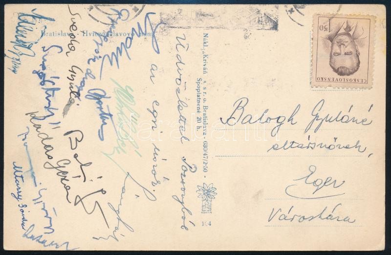 Egri úszók Pozsonyból hazaküldött képeslapja, aláírásokkal (Svéda Gyula, Gyergyák Magda, Kádas Géza, Utassy Sándor, stb.)